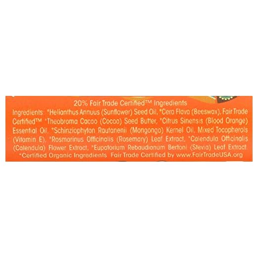 Ingredients: helianthus Annuus (Sunflower) Seed Oil, cera Flava (Beeswax), Fair Trade Certified theobroma Cacao (Cocoa) Seed Butter, citrus Sinensis (Blood Orange) Essential Oil, schinziophyton Rautanenii (Mongongo) Kernel Oil, Mixed Tocopherols (Vitamin E), rosmarinus Officinalis (Rosemary) Leaf Ex