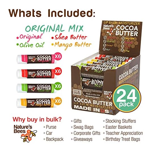 Nature's Bees, Cocoa Butter Lip Balms, Lip Moisturizer Treatment - Pack of 24 (Original Variety Assortments - Original, Olive Oil, Mango Butter, Shea Butter)