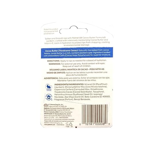 Ingredients:  INGREDIENTS/INGREDIENTES: Mineral Oil (Paraffinum Liquidum), Microcrystalline Wax (Cera Microcristallina). Copernicia Cerifera (Carnauba) Wax, Dimethicone, Theobroma Cacao (Cocoa) Seed Butter, Tocopherol, Helianthus Annuus (Sunflower) Seed Oil, Isopropyl Myristate, Zea Mays (Corn) O