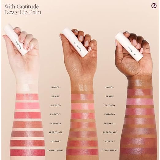 • Rare Beauty by Selena Gomez With Gratitude Dewy Lip Balm Thankful A richly pigmented lip product that delivers comfortable wear with smooth application and a flattering finish. Formulated to balance longwear and hydration; suitable for daily wear and special occasions.